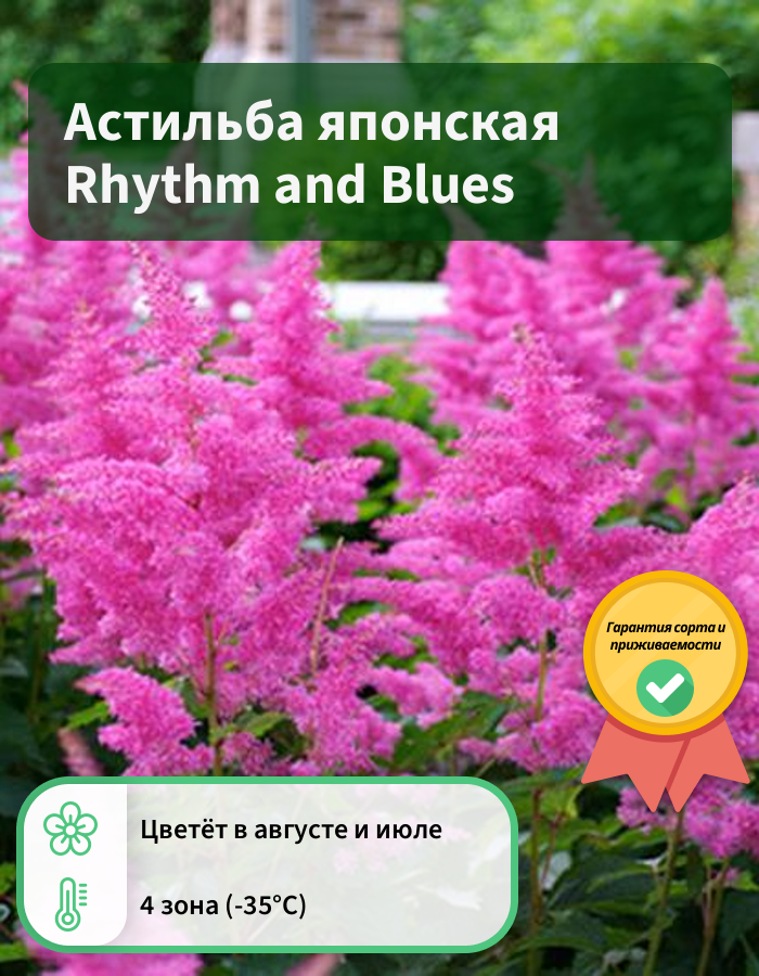 Рассада Астильба японская Ритм энд Блюз (Rhythm and Blues) к пику своего цветения достигает размера 60 сантиметров и представляет собой плотные и пушистые соцветия с сочным ярко-розовым цветом. Листья у данного вида очень крупные темно-зеленых оттенков. Семена необходимо высеивать на подготовленную и богатую удобрениями почву. Оптимальное место произрастания - затененные участки вблизи водоемов. Период цветения выпадает на конец июля - август. Среди отличительных особенностей астильбы японской Ритм энд Блюз можно выделить: