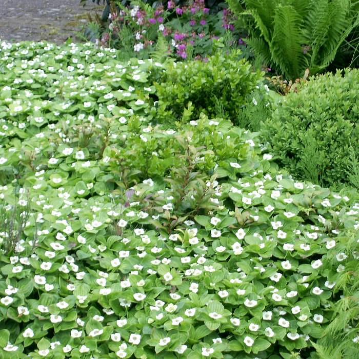 Саженцы канадского дерена образуют эффектные ковры, плотно покрывая почву зеленой листвой. Во время интенсивного цветения карликовые кустарники выпускают множество белых цветов, которые затем становятся красными неядовитыми ягодами. Используется в качестве почвопокровного растения. Особенности крупномера канадского дерена:
