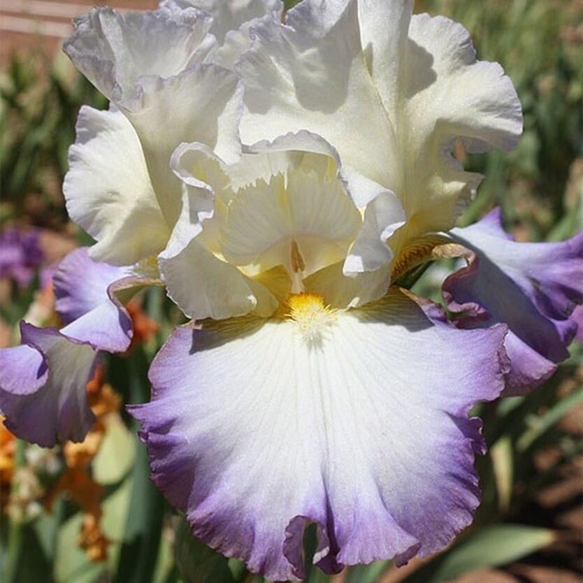 Рассада Ириса Туман на Горе (Mist On The Mountain) дополнит дизайн цветника, приусадебной территории, клумбы. Верхние лепестки бело-кремовые, нижние белые с фиолетовой каёмочкой. Преимущества сорта:
