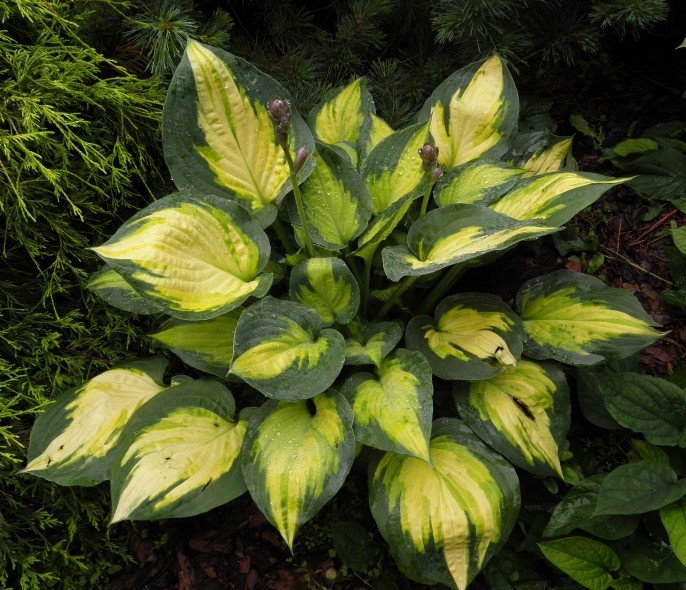 Хоста Гибридная Форбидден Фруит (Forbidden fruit Hosta hybridum) украсит любую клумбу своей необычной раскраской листьев. Они имеют ярко-желтый центр, который со временем теряет окраску и становится практически белым. По краю лист насыщенно-зеленый. Такое растение само по себе смотрится ярко и оригинально, а в июле-августе на нем появляются еще и небольшие лавандовые цветы. Цветоносы вырастают на высоту 40-50 сантиметров, они красиво смотрятся на фоне сплошной зелени. Forbidden fruit Hosta hybridum хорошо растет при затенении, но можно выращивать его и на солнечных участках.