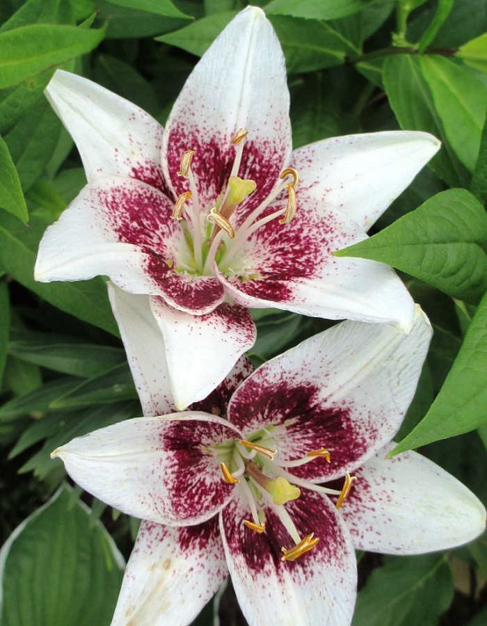 Окраска цветка : белый с густым вишневым крапом до середины лепестков