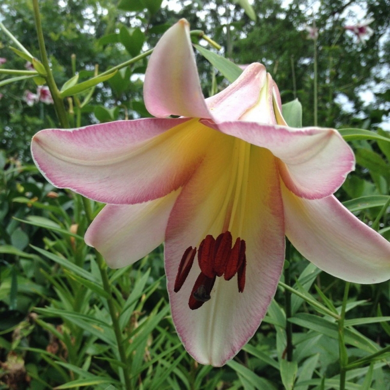 Окраска цветка : белый с сиреневой каймой и жёлтым центром