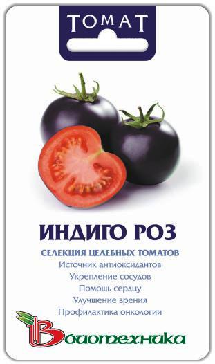 Томат Indigo Rose ( Индиго Роуз) также известный как фиолетовый томат. Это сорт стал победителем выставки Челси (Лондон) в 2014 году. Это сорт получен Джимом Майерсом в университете штата Орегон при скрещивании диких видов томата. Этот сорт уникальный не только по окрасу (с наружи фиолетовый внутри красный), но и по содержанию антоцианов, которое больше чем в чернике. Основным достоинством является, то что этот сорт устойчив к фитофторозу и пониженным температурам. Сорт устойчив к заморозком до – 5 С.